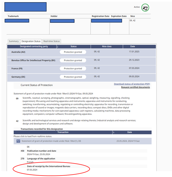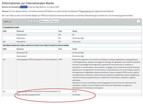 Um zu ermitteln, ob sich eine deutsche Marke, die auf einer IR beruht, noch in der Benutzungsschonfrist befindet, ist ausschlaggebend, ob das Schutzerstreckungsverfahren abgeschlossen wurde und kein Widerspruch mehr möglich ist. Empfehlenswert für den Rechtsanwender ist es, den Madrid Monitor, bzw. das DPMA-Register heranzuziehen. Das maßgebliche Datum wird unter „Date of receipt by the International Bureau“ angezeigt.