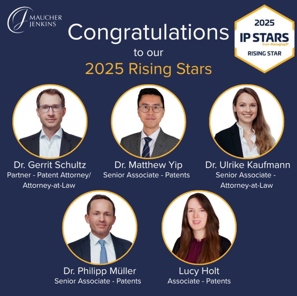 Wir freuen uns sehr, bekannt zu geben, dass Managing Intellectual Property IP Stars die Rising Stars 2025 veröffentlicht hat. Herzlichen Glückwunsch an unsere Rising Stars 2025: Felix Rummler, Dr. Fiona Kellas, Tanya Buckley, Stuart Rowlands, Philipp Nordmeyer und Tim Young!