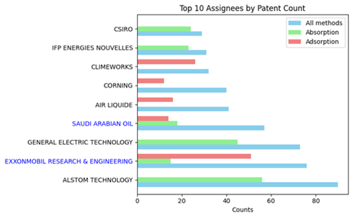 Figure 3 - Top 10 Assignees in the carbon capture field for general, absorption and adsorption methods.