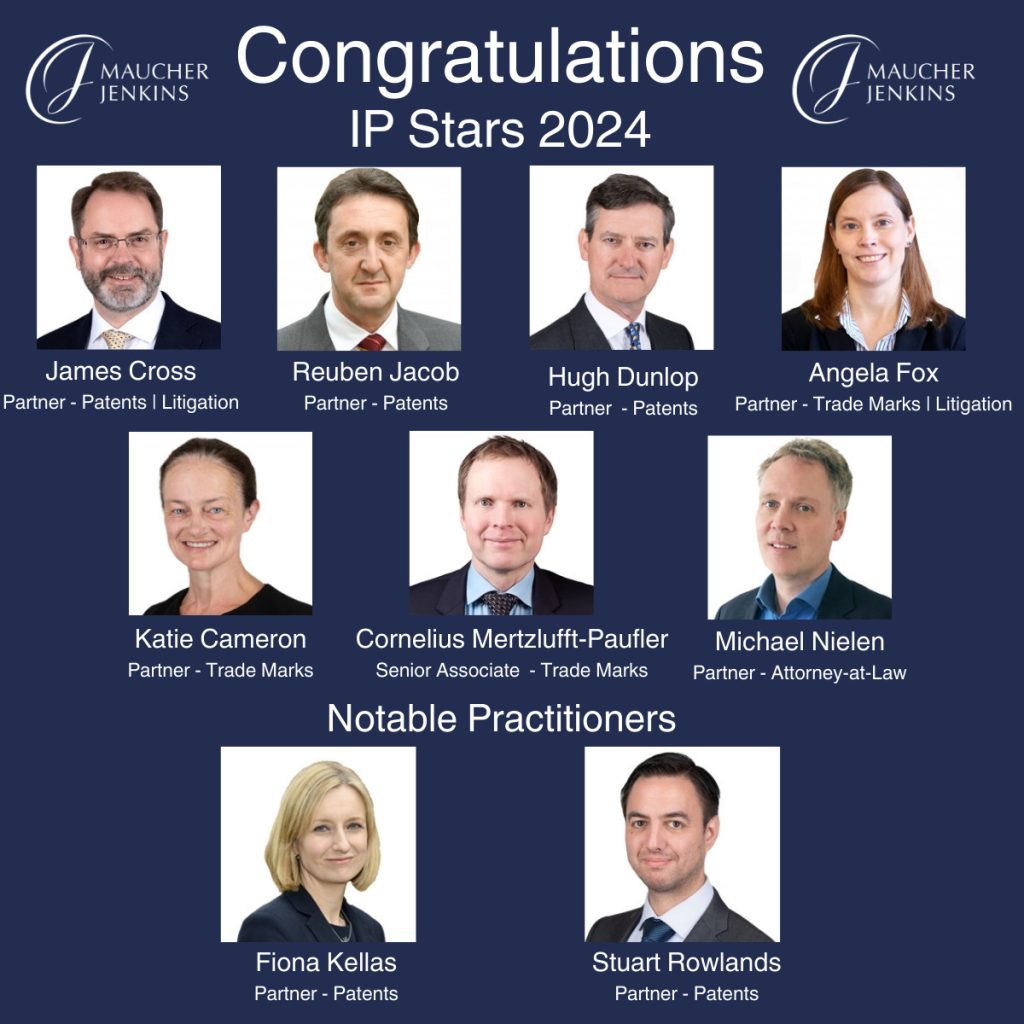Congratulations to James Cross, Reuben Jacob, Hugh Dunlop, Angela Fox, Katie Cameron, Cornelius Mertzlufft-Paufler and Michael Nielen on becoming IP Stars 2024. Congratulations also to Fiona Kellas and Stuart Rowlands for being chosen as Notable Practitioners 2024.
